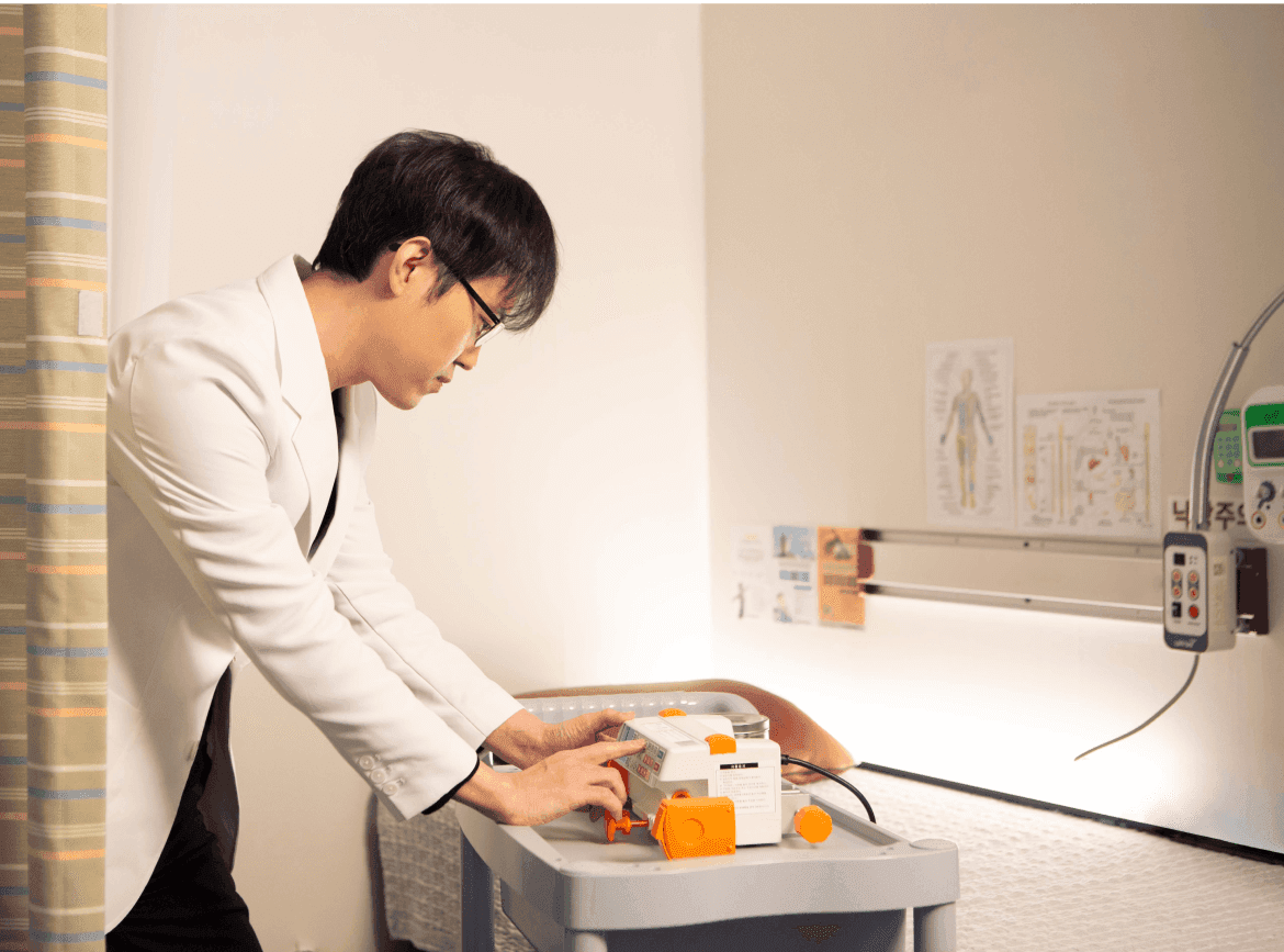 •복부경혈, 천추혈에 메가약침기기를 이용하여 약침을 전달하는 전신 치료요법으로 침술 치료의 통증은 최소화하면서 치료 효과가 매우 높습니다.
